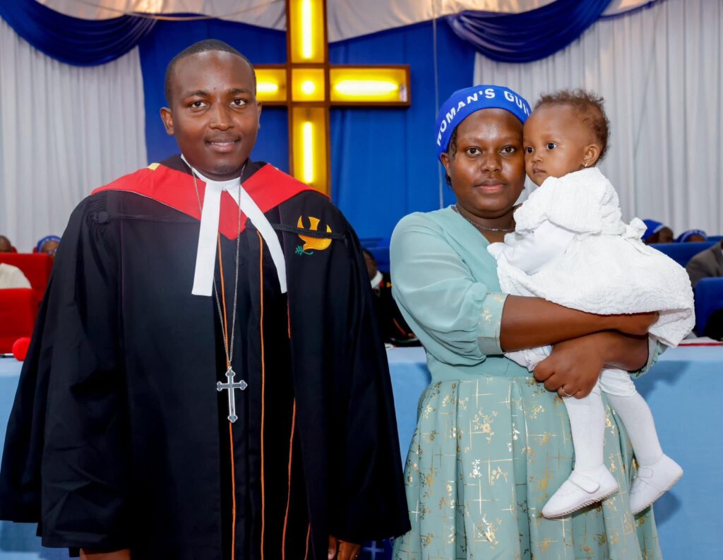 Reverend Joseph Mburu and his wife and child shortly after his ordination at PCEA Ongata Rongai Church in Kajiado North on Sunday, an event attended by political leaders including Rigathi Gachagua, who later defended the Mt. Kenya community’s support for President Ruto.