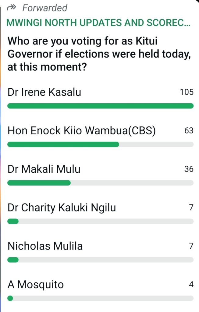 The poll, which sampled 222 respondents, shows Kasalu commanding a strong lead with 105 votes, followed by Senator Enoch Kiio Wambua (CBS) at 63 votes, and Dr. Makali Mulu at 36 votes. Former Governor Dr. Charity Ngilu and Nicholas Mulila tied at 7 votes each, while a lighthearted entry, “A Mosquito,” garnered 4 votes in protest.