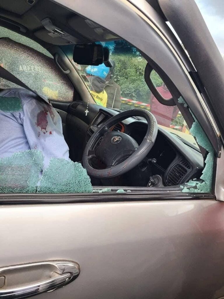 The shattered windscreen of lawyer Mathew Kyalo Mbobu’s car along Magadi/Lang’ata Road in Karen South, Nairobi, where he was fatally shot in a drive-by attack on September 9, 2025. The brazen assassination has sparked outrage, with the Law Society of Kenya condemning the killing as a targeted assault on the legal profession and calling for swift justice.