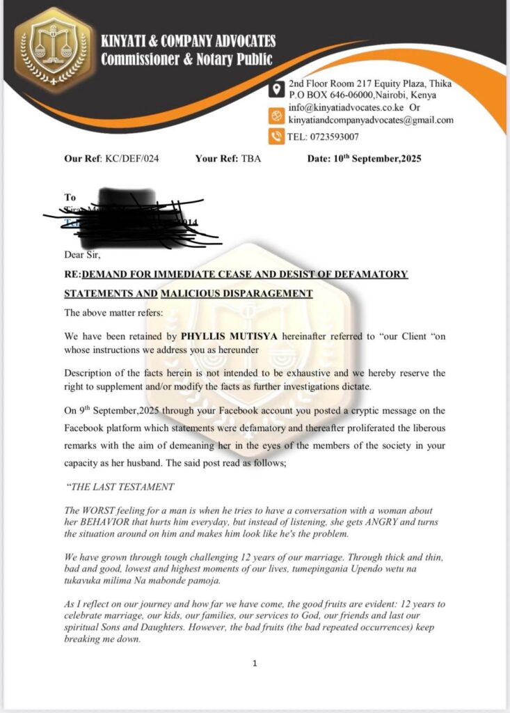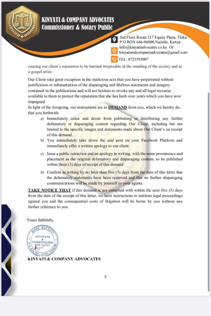 But the saga took a fresh turn when actress Tina Clara surfaced online two days ago, sharing what appeared to be demand letters from Mutisya’s legal team.