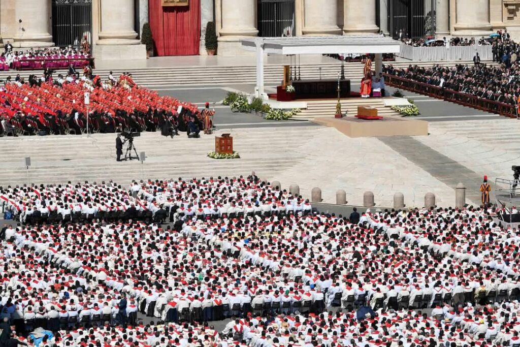 The burial rite began with the chanting of four psalms and five intercessions, followed by the Our Father. After the final prayer, sigils representing key Vatican offices — including those of Cardinal Camerlengo Kevin Joseph Farrell, the Prefecture of the Papal Household, the Office of Liturgical Celebrations of the Roman Pontiff, and the Liberian Chapter — were imprinted on the Pope’s coffin.
