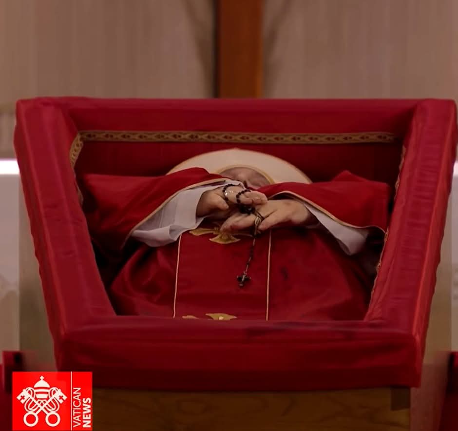 The Vatican has released a solemn image of Pope Francis lying in rest inside the chapel of Santa Marta, the very place where he celebrated Mass almost daily throughout his papacy. The poignant photograph shows the late pontiff dressed in simple white papal vestments, his hands gently clasped, surrounded by candles and floral tributes in the quiet sanctuary.